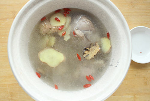 3.将羊肉取出放电炖锅内,将姜片、当归和枸杞放入,倒黄酒,把煮羊肉的汤用细箩过滤一下倒进锅中,煲三四个小时就齐了