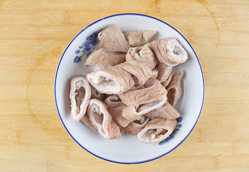 大肠翻过来去部分肠油,用碱和盐抓一会儿,冲冲,再用醋抓一会儿洗净,放高度白酒焯两遍水切成小段备用