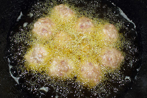 锅中倒油烧至六七成热,肉馅挤成丸子放油中炸至表面定型约七八成熟就可以了