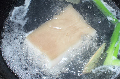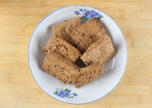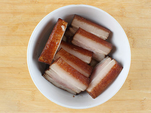 趁热抹酱油上色,在八成热的油中炸一下,至表皮变成深棕色切大厚片备用