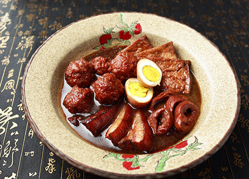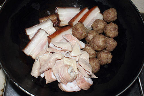 五花肉,丸子和大肠分别码在锅中,倒入热水刚刚浸过原料,烧开,放酱油,黄酒,酱豆腐,冰糖和适量盐,再放四种香料和葱段姜片烧开后转最小火,最后放几粒红米提提色,盖锅盖焖烧二个半小时左右即可,到二个小时的时候可以把炸豆腐放进去一起煮