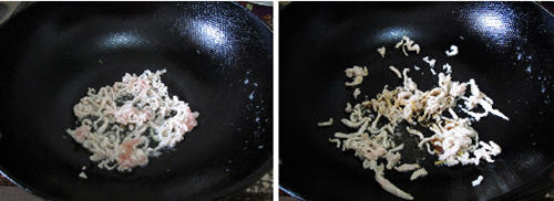 7 另起锅,注入油,爆香姜丝下入肉丝煸炒。