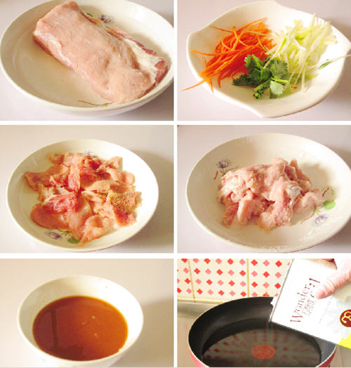 3 猪里脊肉切厚片后加少许料酒,盐,胡椒粉腌制入味。