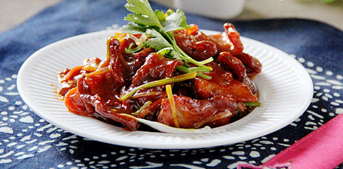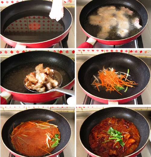 12 烧制汤汁粘稠后倒入炸好的肉片翻炒均匀,让每片肉都能裹上汤汁后撒上香菜即可。