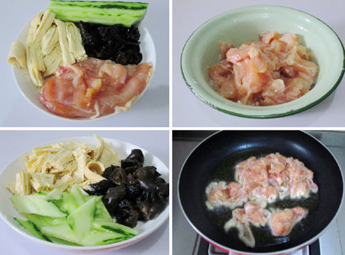 3 腐竹切段,木耳撕成小朵,黄瓜切片。