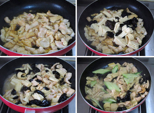 4 锅中注入油,烧热下入鸡肉片翻炒至变色。