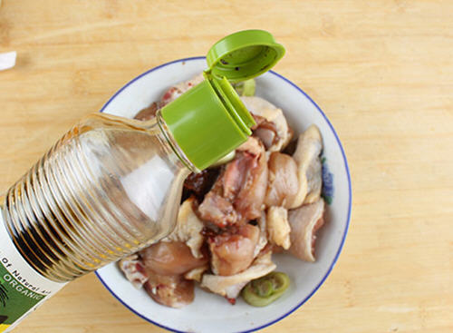1、鸡处理干净,连骨带肉剁成约四公分大小的块儿,用腌鸡调料抓匀腌一小时左右。