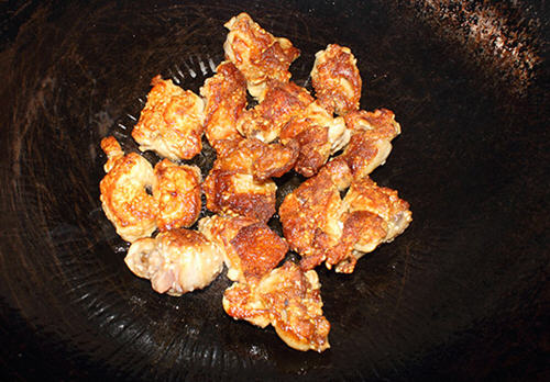 4、锅烧热,倒少许油涮锅,将鸡块快速分散的放下去中火煎至两面焦黄酥脆完全熟透盛出。