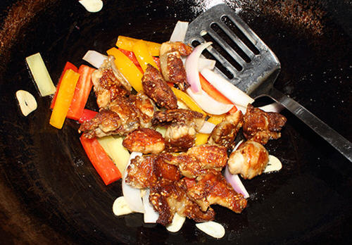 5、不用刷锅,直接把所有切好的蔬菜和姜蒜片全部下去大火炒十五秒出香气,将炸好的鸡块倒下去稍微撒一点点盐,大火炒几下出锅既成。