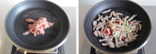 5、烧热锅放入适量的油,下入腌制过的肉丝翻炒;