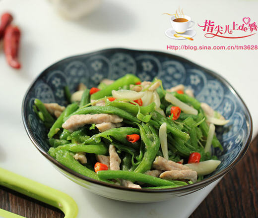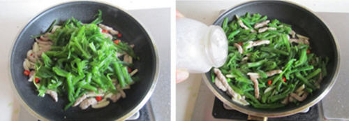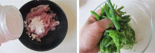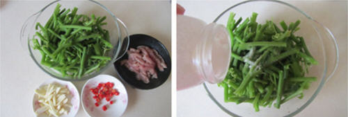 2、肉丝提前加入盐等调味料码入味; 炒时要先炒肉丝, 再爆香调味料, 最后再加入南瓜梗翻炒, 加入盐等调味。