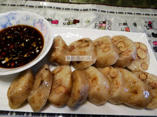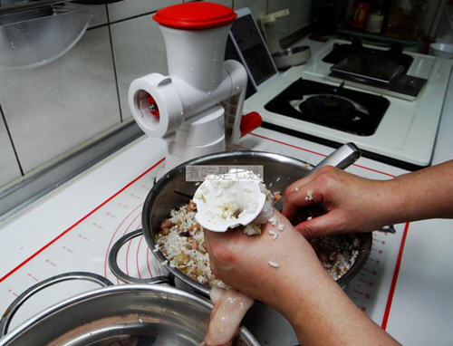 2、将泡好的米、 冷冻过的生花生、油葱酥及盐巴搅拌后,就可以开始灌了
