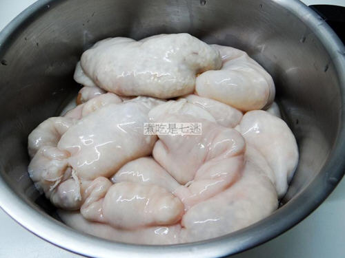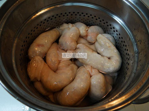 5、开始煮,冷水要盖过大肠,开中火,水滚后计时55分钟,就好了!起锅前试吃一下,如果不够烂,就再煮 一下,直到可以的程度。