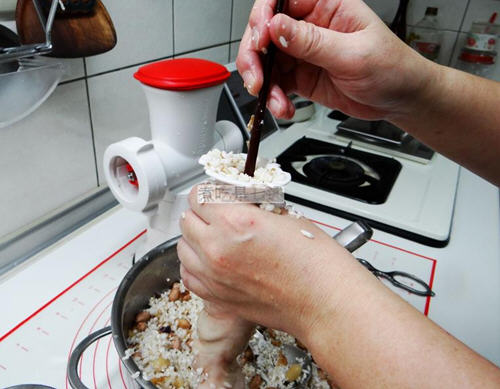 3、先绑住大肠的一端,拿一个漏斗(只要花生掉的下去的,就可以用),装适量的米馅料,用一根筷子(粗的那头)戳进去大肠里面,再用手将馅料往下推