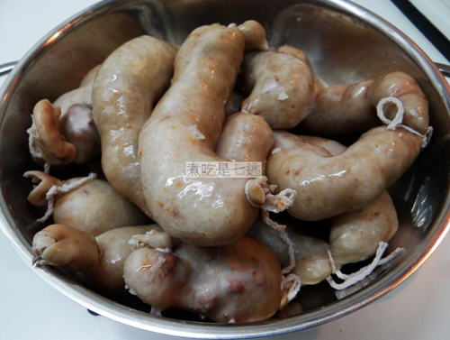 4、灌好的样子。不要灌太满,适当的长度就绑棉线,灌好的大肠也不要戳洞,只要没有灌太饱,煮的时候就不会撑破。