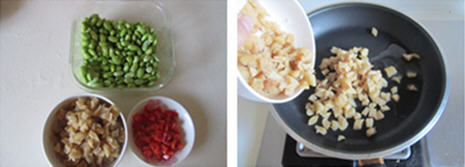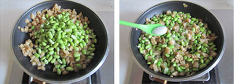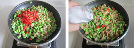 5、毛豆米翻炒至九成熟的时候加入红椒丁进去翻炒;