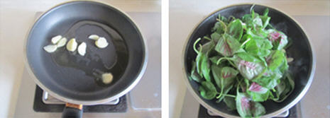 2、炒苋菜时先爆香一下蒜片,加入苋菜翻炒,炒软后加入腐乳一起翻炒;由于腐乳块有一定的咸度,注意加入盐块的量。