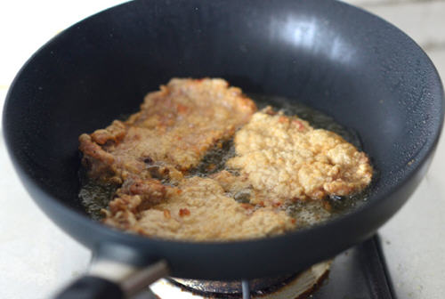 5、 锅里倒入比平时炒菜多一些的油,热油放入大排煎炸至大排定型。(油温要高一些,大排不需要炸太焦,定型后就可以了,这样能锁住大排的水份不流失,口感吃起来才嫩。忌小火久炸,否则大排水份没了,肉老了就不好吃啦)