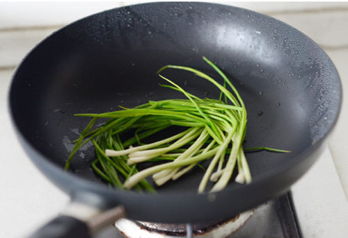 6、 锅里留少量底油,放入葱,小火煎一会至葱出香味。