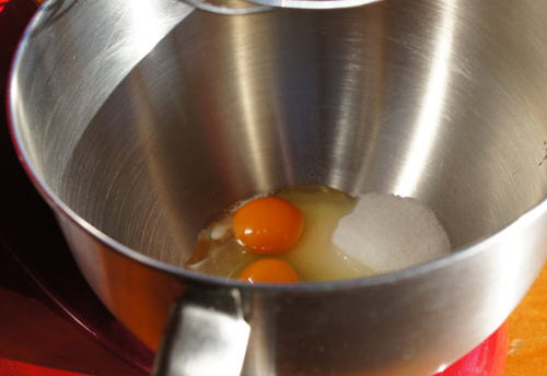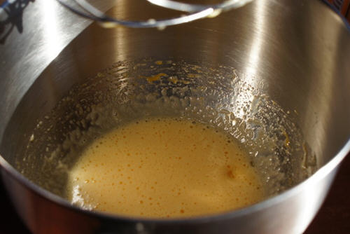 1、用打蛋器打发鸡蛋和糖至浓稠状态。
