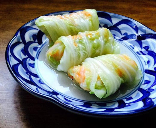 2、高丽菜用手拨开取大叶片,在滚水中烫一下变软,取出待凉,入虾馅包卷好,放入锅加水蒸熟即可享用。