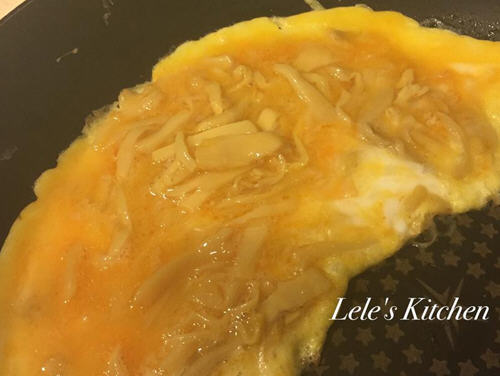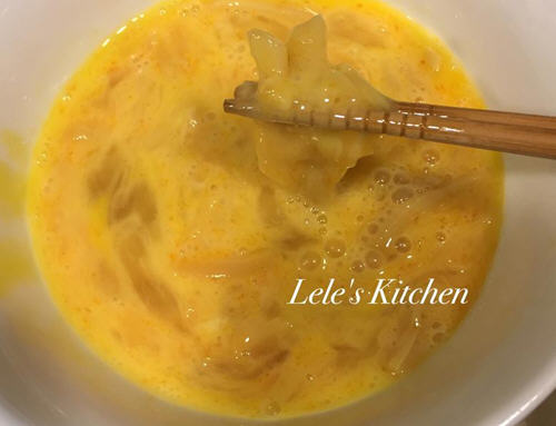 2、热油锅,将蛋液倒入锅中煎至两面都呈现金黄色即可!