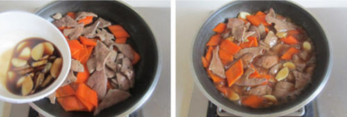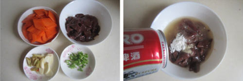 原料:猪肝、红萝卜、姜丝、啤酒、生抽、料酒、淀粉、油盐适量
