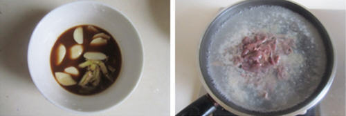 3、调整好碗汁: 生抽、料酒、盐、淀粉、胡椒粉和姜蒜片,拌均匀备用;