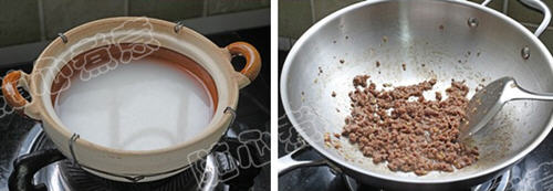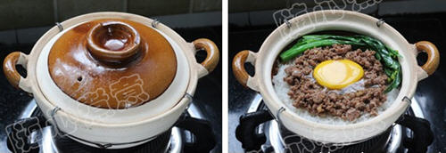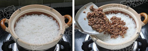 5、待砂米饭水分基本烧干成形后,打开盖子,将炒好的牛肉碎均铺在米饭上,并沿着砂锅边缘淋上一点油,加盖继续用小火焖煮5分钟,关火后不要打开盖子,继续焖5分钟。