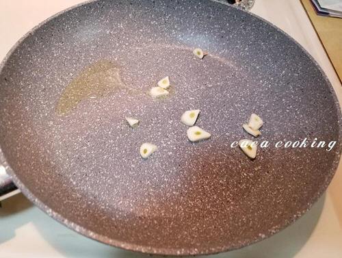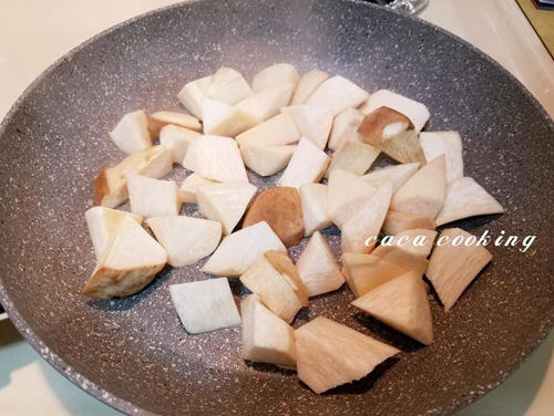 3、热锅加少许的油,将杏鲍菇下锅,加入2匙米酒,炒至杏鲍菇变软后盛起。