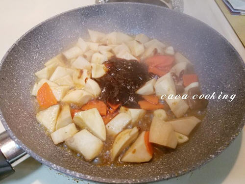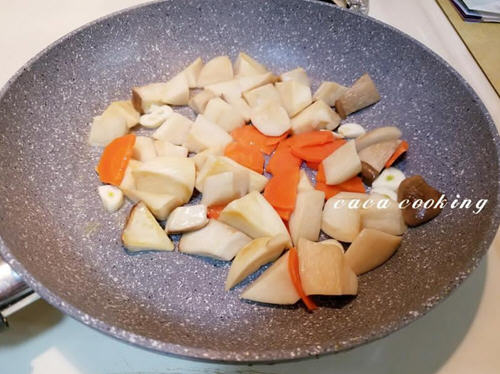5、把红萝卜及杏鲍菇加入,可加少许的水煨炒一下。