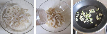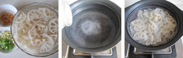 2、焯煮藕片时加入点盐, 焯好的藕片立即捞出来放入冷水中浸泡, 这样能保持藕片的爽脆和嫩白;