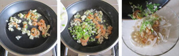 3、煸香葱油时, 先煸炒姜蒜末, 再放入泡过的干虾仁进去煸炒, 最后放入易熟的香葱进去煸炒, 煸香后即可用来拌藕片。