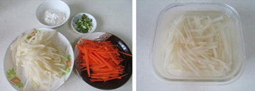 1、准备好原材料胡萝卜和土豆清洗干净后切细丝。