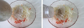 3、将土豆丝、胡萝卜丝和面粉放入大碗中;