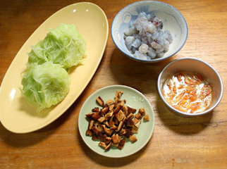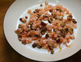 3、虾仁去除肠泥切丁;干燥香菇加水泡软后,捏掉多余水份切丁;樱花虾加入米酒泡软备用。