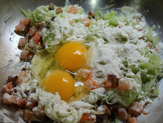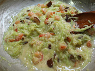 主料:蒲瓜1颗、鸡蛋2颗、中筋面粉6大匙、虾仁200g、干燥香菇(小)3朵、樱花虾1大匙、米酒2大匙