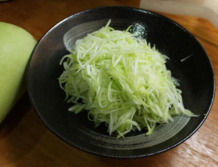 1、蒲瓜去皮剖四半,将瓜肉刨成丝,内囊不要(皮刨掉后,不急着将内囊去除,刨瓜肉时,有内囊好握,较不易刨到手)。