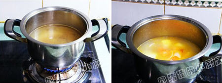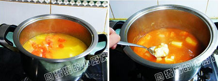 10、30分钟后,再放入事先炒香的蔬菜块(蕃茄除外)继续用小火煮30分钟。
