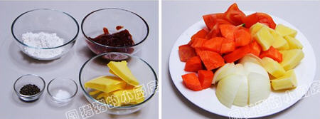 材料:新鲜牛肉1斤,中型白洋葱半颗,胡萝卜1个,土豆1个,中型蕃茄两颗,黄油,鲜奶油,鲜奶,蕃茄酱,盐,黑胡椒粉(带颗粒的那种),鸡精,1小匙白糖(如果有做奶白酱的就不用另加鲜奶油和鲜奶了)。