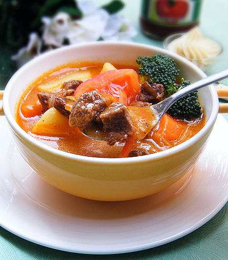 11、最后再加入蕃茄块。继续用小火煮至牛肉和蔬菜块都软烂了。放入蕃茄酱,盐,鸡精,1小匙白糖(因为加了蕃茄蕃,这里加一点糖可以综合一下)
