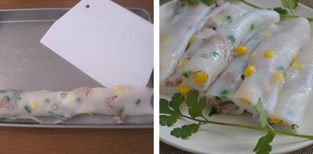 14-15、用刮板从一边开始刮起肠粉,轻轻卷起。