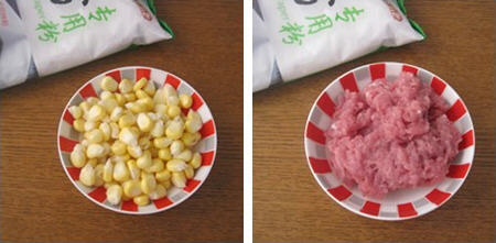 11、放上适量瘦肉、玉米粒,再撒上葱末。