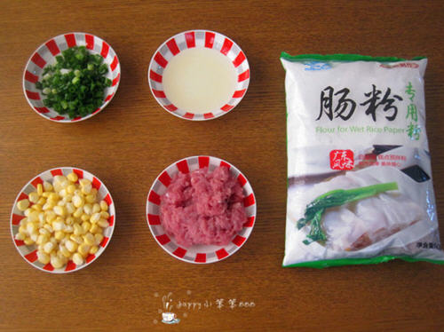 材料:白鲨牌肠粉专用粉100克、清水240克、玉米、瘦肉、小葱。