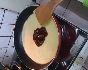 2、翻面后加上1匙泰山黑八宝,再合起,起锅。