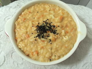 3、当白米吸收汤汁之后,再继续倒入高汤,直到白米煮成香Q的饭粒。大朋友可以加入少量盐调味即可美味上桌。