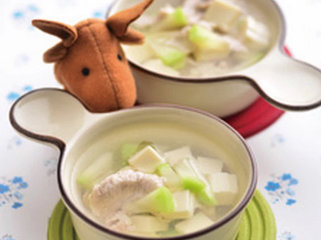 瓠瓜豆腐肉片汤,中的嫩里肌肉是猪肉中最嫩的部位,很适合烹调给宝宝食用。也可以先用铁汤匙将里肌肉刮成泥。瓠瓜可以改成丝瓜、冬瓜或白萝卜,这类食材煮熟之后非常软嫩,很适合宝宝尚在发育的牙齿和口腔。总的来说瓠瓜豆腐肉片汤非常鲜美可口,对宝宝的生长发育的营养价值很高哦!