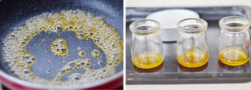 9、将熬好的糖浆趁热倒入布丁杯的底部。