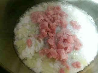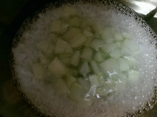 3 、煮至大黄瓜熟透后加入绞肉,一点点盐一起炖煮。