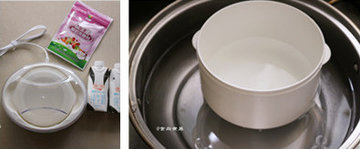 1、备好酸奶机、酸奶发酵剂、纯牛奶、酸奶机内胆和盖子用开水消毒一下,沥干水。